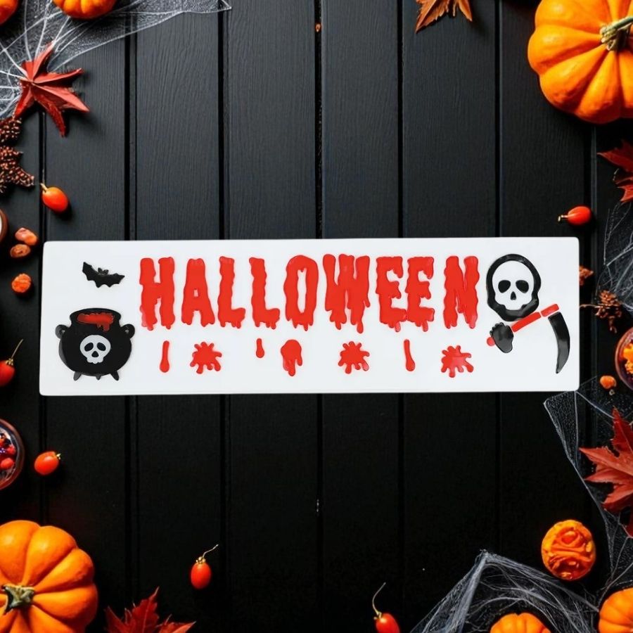 O Adesivo de Gel Decorativo de Halloween - Morte é um conjunto com 20 peças que inclui a palavra "Halloween", dona Morte, pingos de sangue e um caldeirão. Perfeito para criar uma decoração assustadora e detalhada, esses adesivos são indicados para aplicação em superfícies lisas e não porosas, como vidro, espelhos e azulejos.