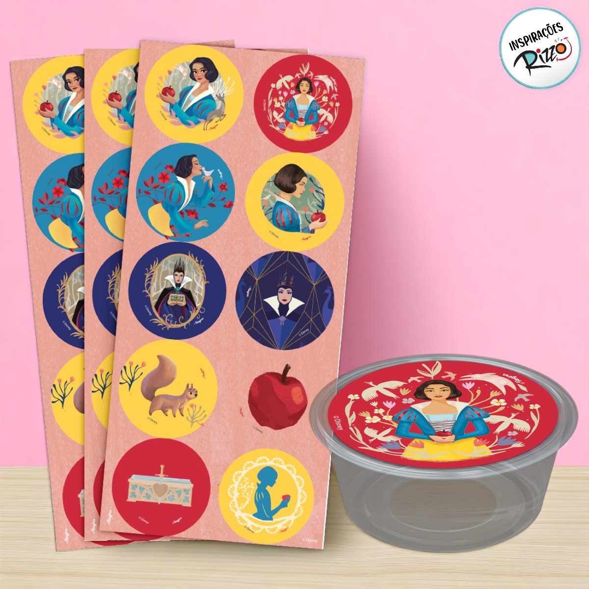 Adesivo Redondo inspirado na Princesa Disney Branca de Neve, composto por 3 cartelas com 10 adesivos de 4cm cada. Perfeito para personalizar sacolinhas de lembrancinhas, tubetes, latinhas mint to be e outros itens da festa, trazendo charme e temática encantadora.
