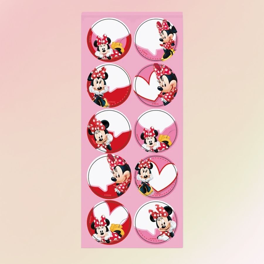 O Adesivo Redondo temático da Minnie Mouse Disney no tamanho 4x4cm é um item delicado que combina beleza e utilidade em diferentes aplicações decorativas e funcionais. A cartela acompanha 10 adesivos, cada um com espaço pensado para escrita, permitindo incluir nome, pequena mensagem ou identificação de forma prática. O formato redondo facilita a aplicação em embalagens, lembrancinhas e materiais escolares, enquanto a temática da Minnie Mouse Disney em tom rosa traz um visual suave e encantador. O adesivo transforma simples identificações em detalhes visuais que enriquecem a composição do tema e ajudam a organizar os itens com charme.
