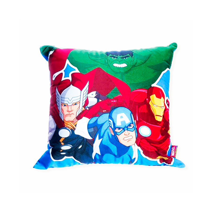 Almofada temática de Avengers. Cuidados e recomendações de uso: Passar com temperatura máxima de 110° (sem vapor). Não alvejar. Permitido uso de centrifuga e máquina secadora. Temperatura máxima de lavagem 40°. Não limpar a seco.
