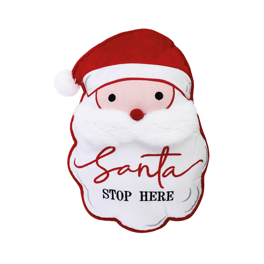 Almofada com design do rosto do papai noel, com a mensagem em sua grande barba branca "Santa Stop Here"