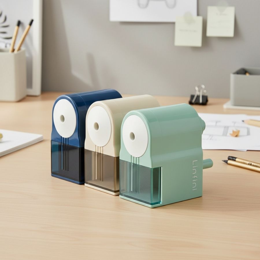 O Apontador de Mesa Manual Linfini é prático e resistente, ideal para apontar lápis grafite de até 8mm, oferecendo estabilidade no uso e sendo enviado em uma unidade com cor sortida (azul, verde ou areia).