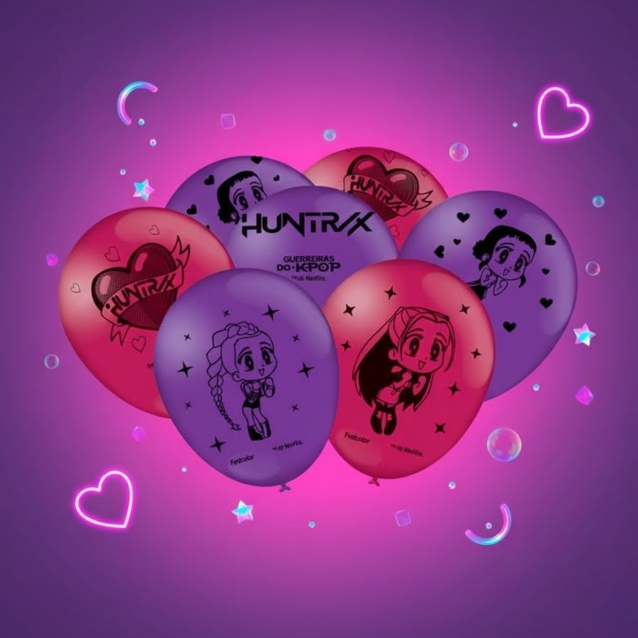 O Balão Decorado Guerreiras do K-pop – Ghibi Personagens combina o encanto do estilo Ghibi com a energia das heroínas do universo K-pop, criando um visual irresistível para festas modernas e cheias de personalidade. Perfeito para compor arranjos, preencher cenários e destacar a paleta vibrante do tema.
