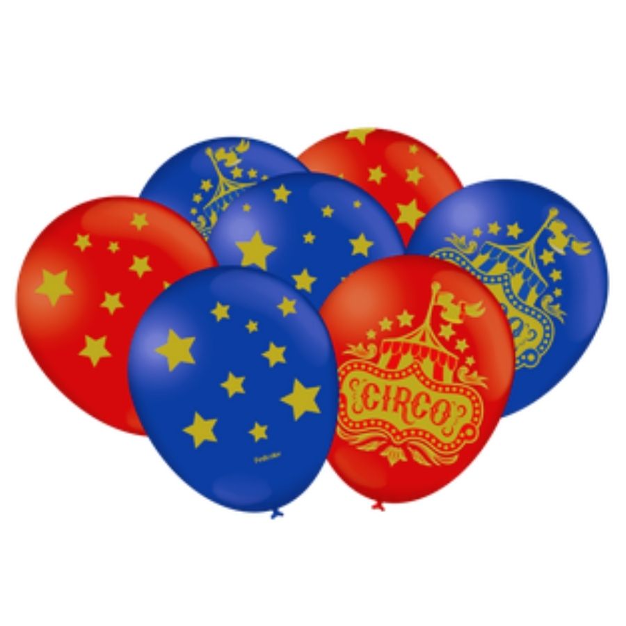 Balão de festa decorativo com tema circo, tamanho 9", acompanha 25 unidades. Ideal para criar arranjos, arcos ou destacar áreas da decoração em festas infantis, trazendo alegria e cor ao ambiente.