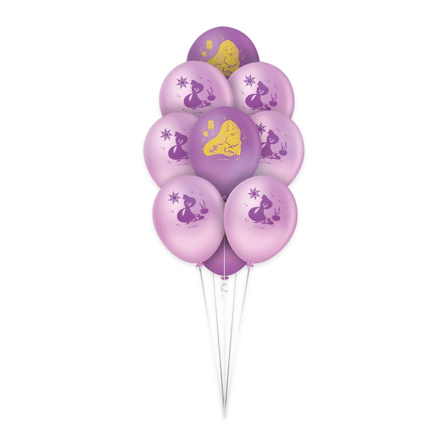 Balão em latex, colorido e estampado com o tema da Princesa Rapunzel.