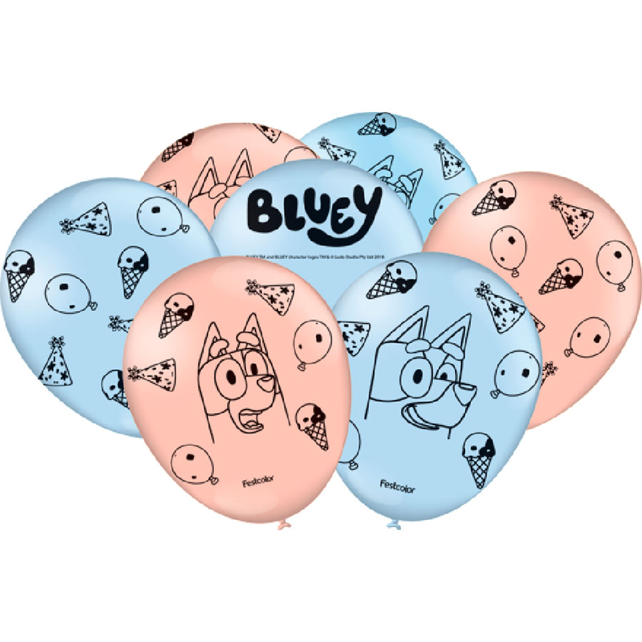 Um pacote contendo 25 unidades de balões decorados com o tema Bluey