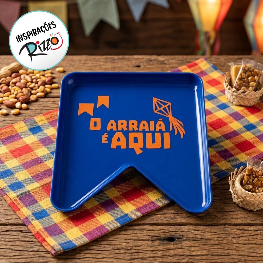 Bandeja decorativa com a frase "O arraiá é aqui"