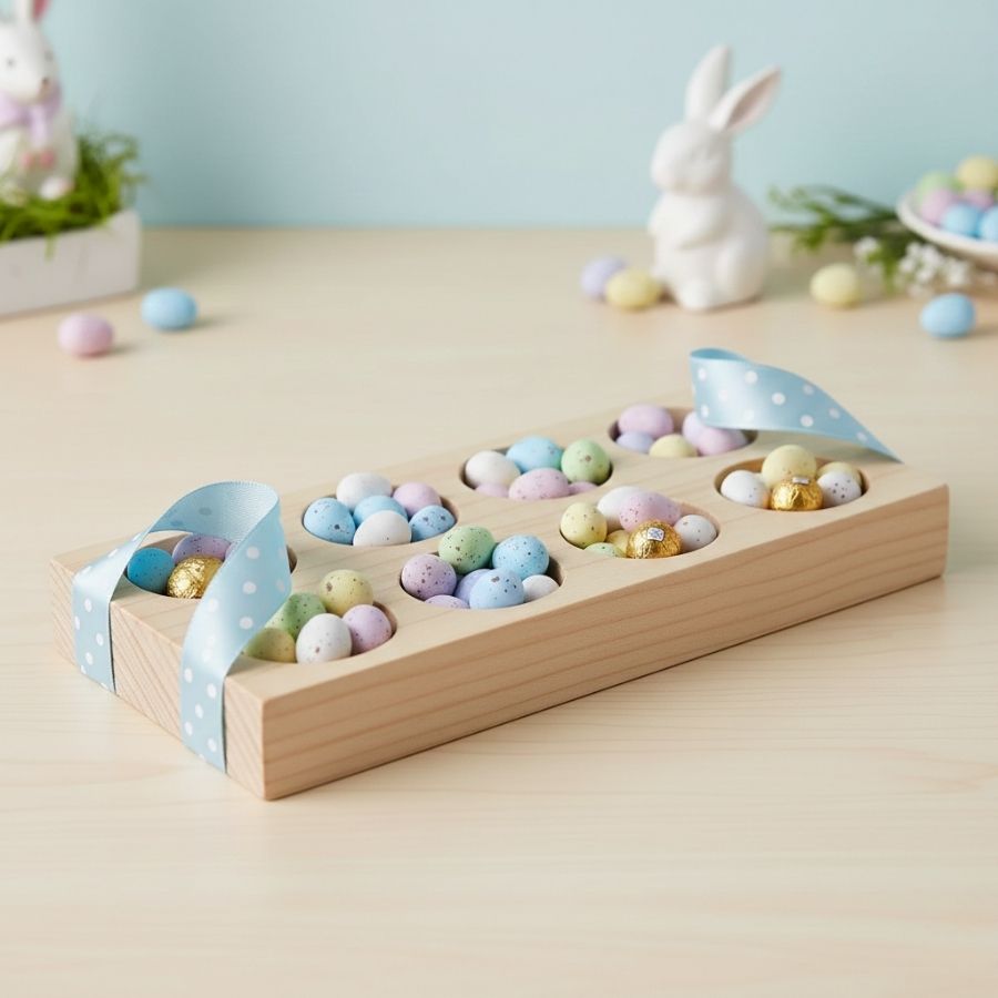 A Bandeja para Doces Azul - Páscoa é uma peça encantadora e funcional, projetada para apresentar e servir pequenas delícias durante as celebrações da Páscoa. Com sua estrutura de madeira e alça, essa bandeja oferece uma maneira elegante de exibir doces e chocolates.