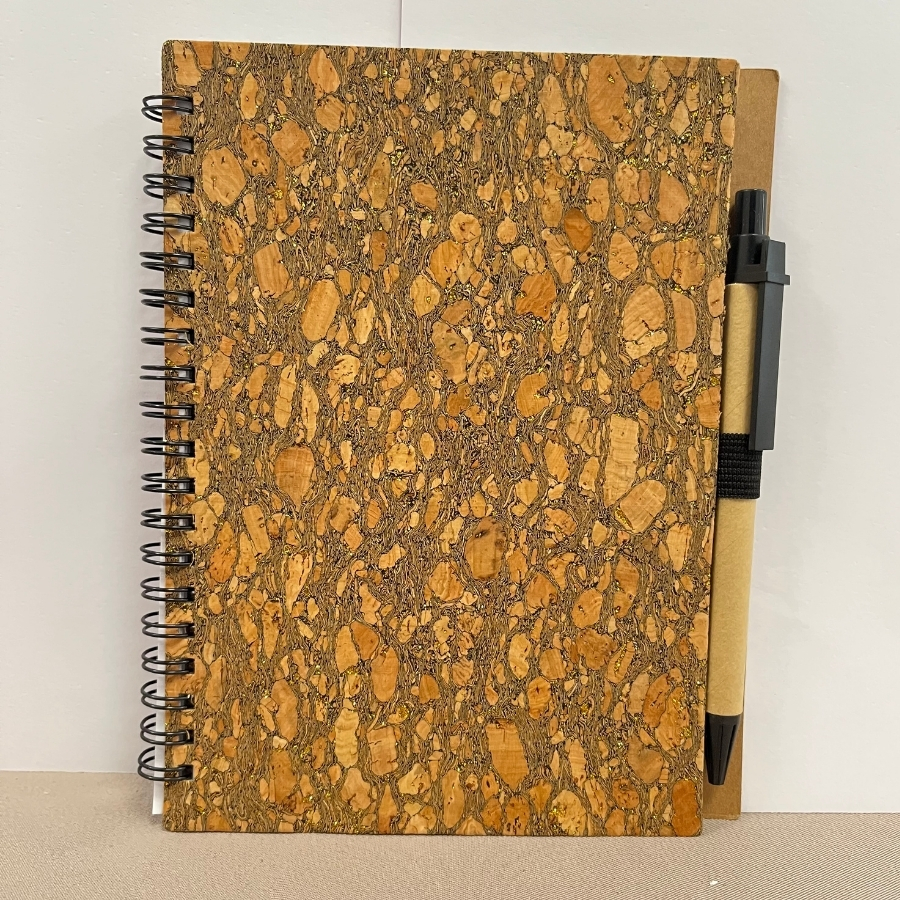 Bloco ecológico com caneta, 70 folhas, 13,5x17,5cm, disponível em acabamentos rústicos e naturais, ideal para uso diário ou presente sustentável.