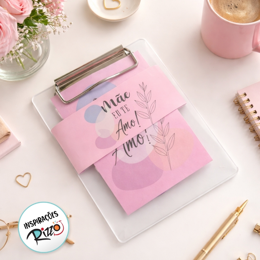 Um mini bloco para anotações com prancheta, acompanhado por uma cinta de papel cartão com a mensagem "Mãe eu te Amo", seria um presente emocionante e significativo para expressar amor e carinho pela mãe. O bloco para anotações ofereceria um espaço prático para fazer anotações, escrever mensagens especiais ou fazer listas, enquanto a prancheta forneceria um suporte estável para escrever em qualquer lugar.
