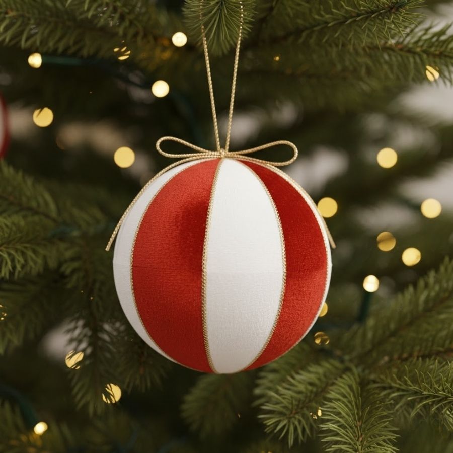 A Bola de Natal - Tecido Vermelho com Listras Brancas - 8cm é um enfeite encantador que adiciona um toque clássico e acolhedor à decoração natalina. Produzida em tecido macio com acabamento de listras brancas sobre fundo vermelho, ela combina tradição e elegância, sendo ideal para decorar árvores, guirlandas, arranjos e centros de mesa.