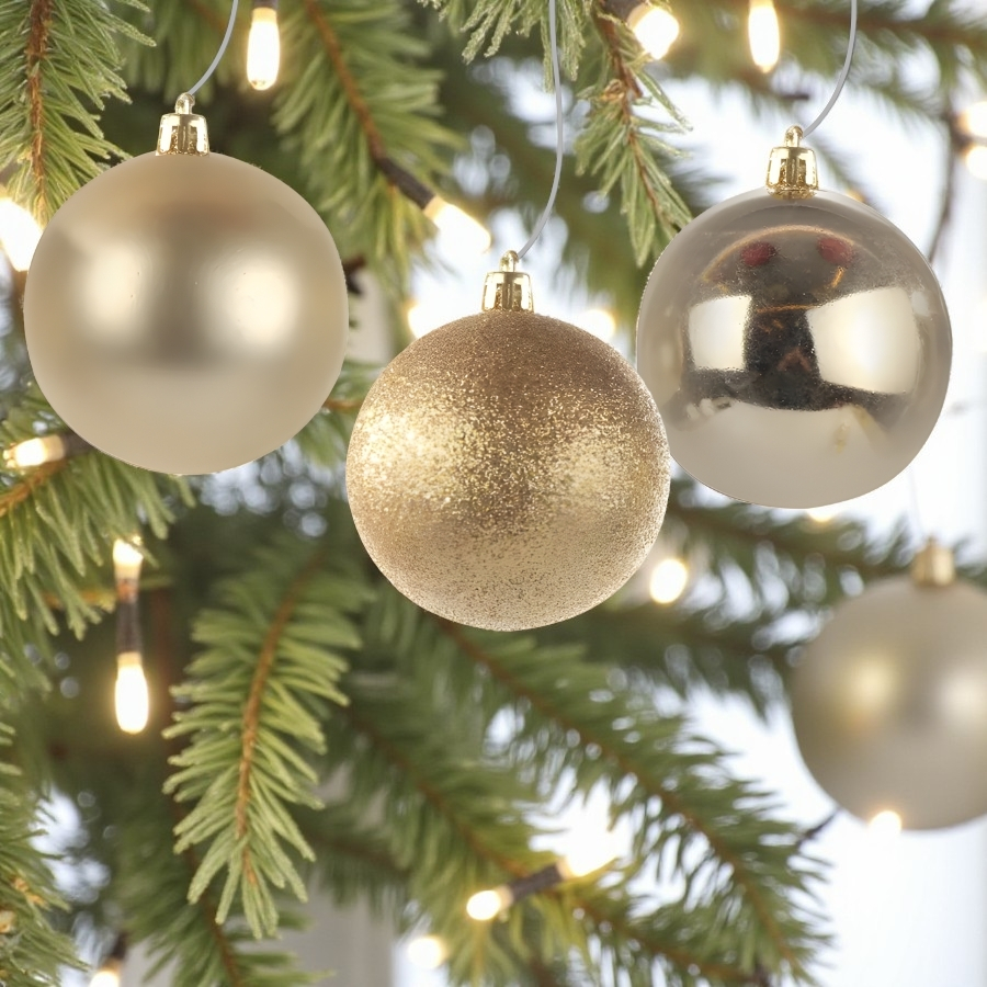O conjunto contém bolas de Natal de 6cm, na cor ouro, com três acabamentos: liso, matte e glitter. Acompanha tubo plástico para armazenamento e organização. Leves e resistentes, são ideais para decorar árvores, guirlandas e arranjos, garantindo uma composição elegante e durável.