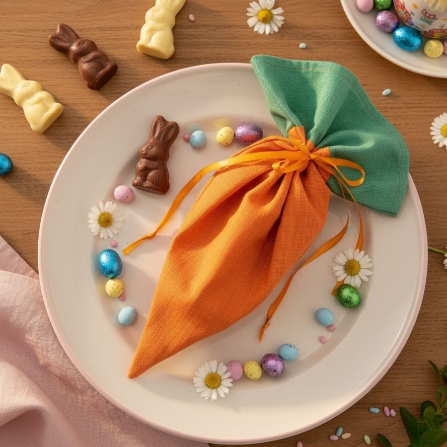 Bolsinha de tecido em formato de cenoura, com fechamento em laço de cetim, disponível em quatro tamanhos. Ideal para presentear ou decorar na Páscoa com chocolates, doces e lembrancinhas.