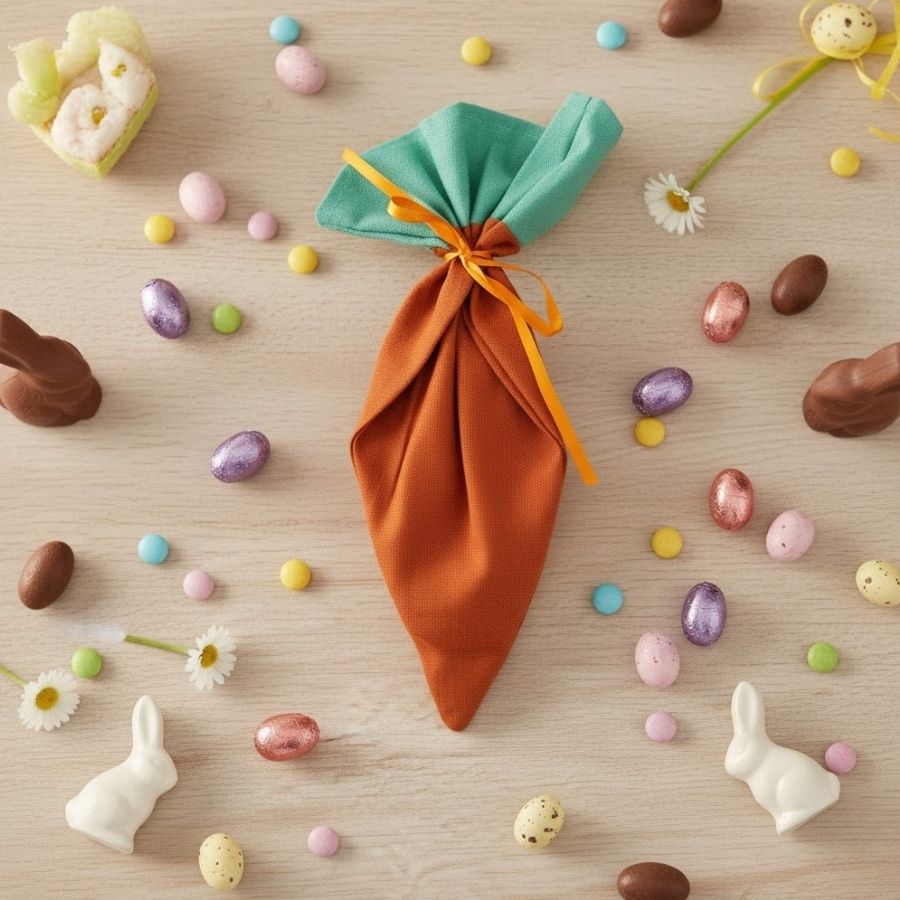 Bolsinha de tecido em formato de cenoura, com fechamento em laço de cetim, disponível em quatro tamanhos. Ideal para presentear ou decorar na Páscoa com chocolates, doces e lembrancinhas.