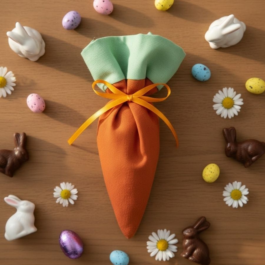 Bolsinha de tecido em formato de cenoura, com fechamento em laço de cetim, disponível em quatro tamanhos. Ideal para presentear ou decorar na Páscoa com chocolates, doces e lembrancinhas.