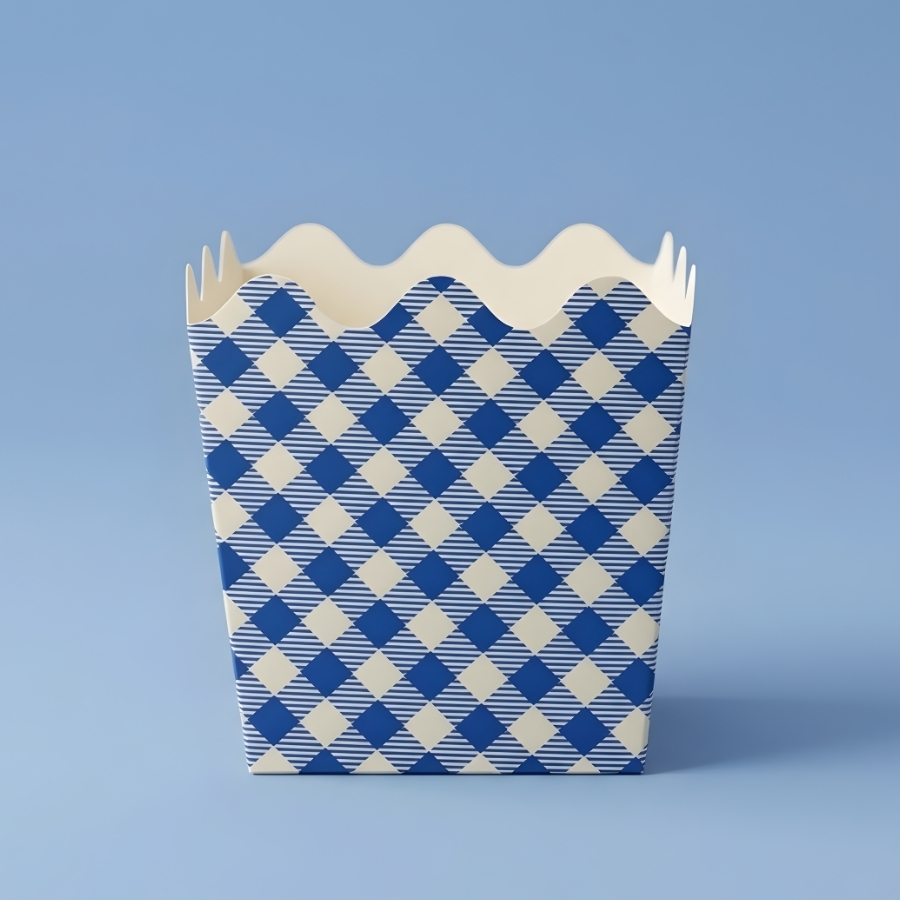 Cachepot fabricado em papel com estampa xadrez nas cores branco e azul. Possui dimensões aproximadas de 9,5x9x9,5cm. Indicado para uso decorativo ou para acomodar itens leves, como doces e pequenos objetos. Produto não indicado para contato com líquidos. Recomenda-se evitar umidade para preservar a estrutura do material.