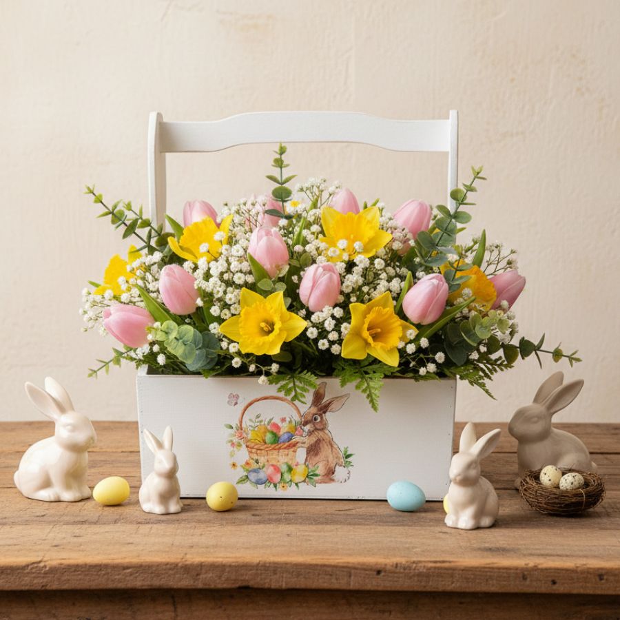 Cachepot com alça de madeira branco para páscoa com desenho de coelho segurando cesta com ovos de páscoa