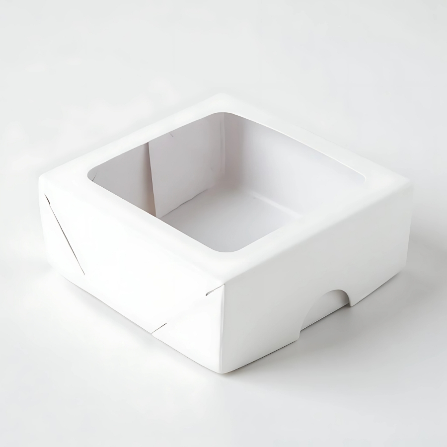 Caixa de papel cartão branca, com medidas de 8cm x 8cm x 4cm e visor transparente em PVC acoplado à tampa. Possui capacidade para acomodar até 4 doces de tamanho padrão. Embalagem resistente, prática para montar e ideal para uso profissional em confeitaria fina ou lembranças personalizadas.