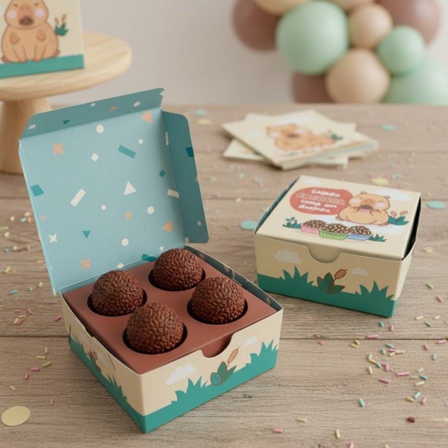 Caixa quadrada para 4 doces, tema capivara, feita em papel resistente. Ideal para presentes, lembranças e confeitaria artesanal.