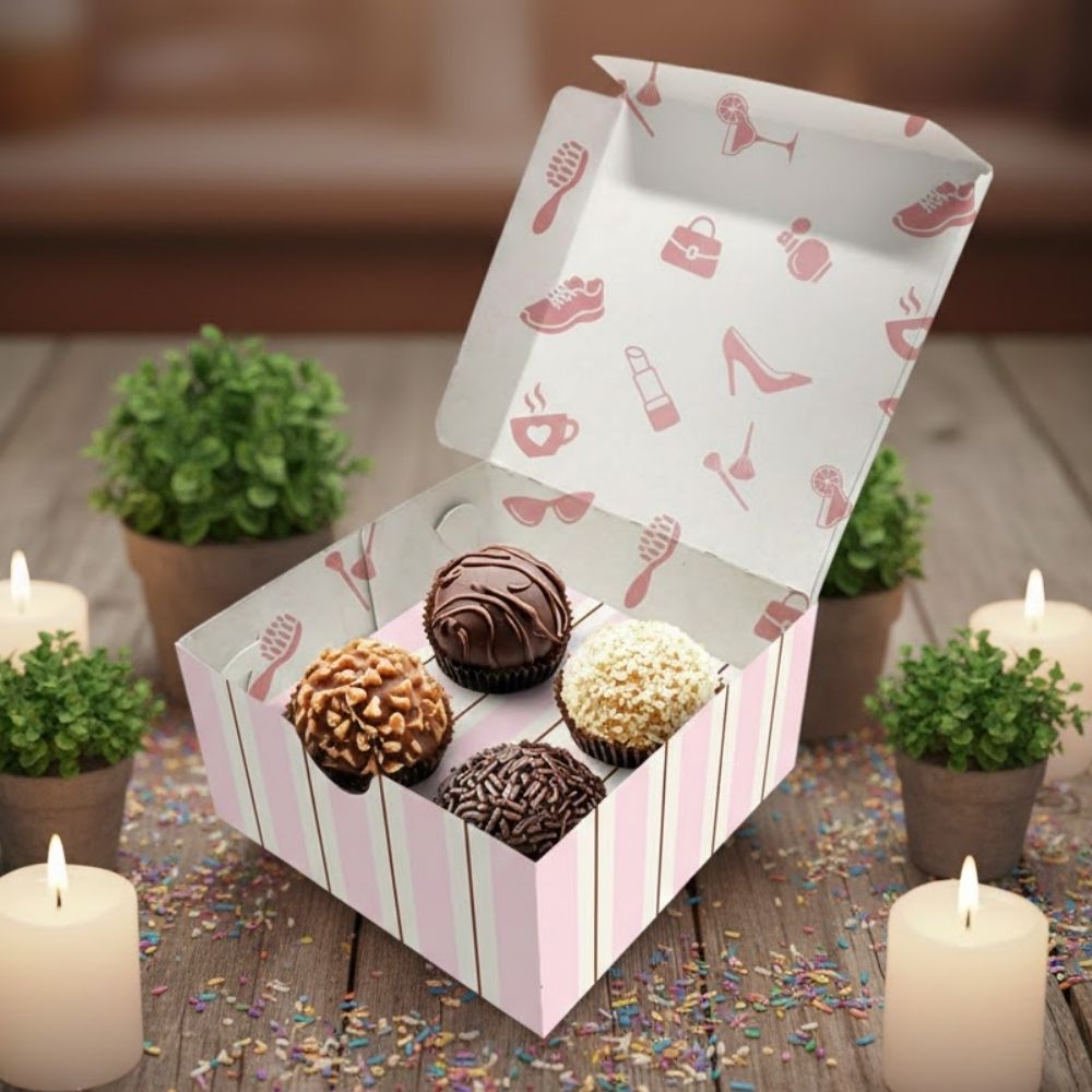 Com aproximadamente 7,5x7,5x6cm, possui tamanho ideal para acomodar até 4 doces, como brigadeiros, trufas ou bombons. Compacta e elegante, valoriza a apresentação e transforma pequenos detalhes em grandes gestos de carinho.