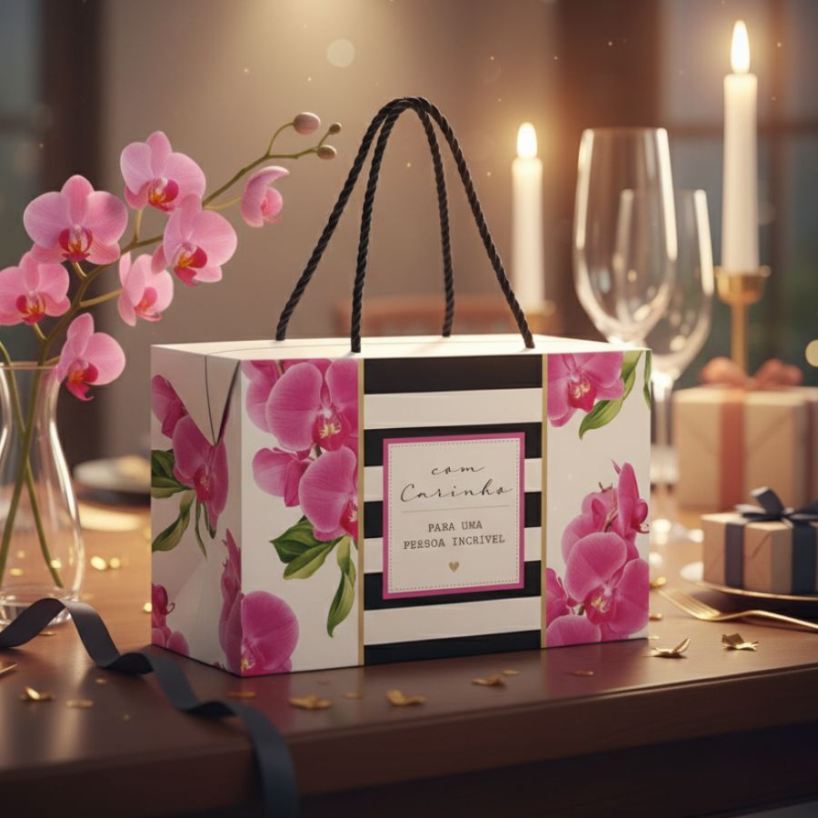 A Caixa com Alça Prime - Celine é resistente, elegante e prática, ideal para presentes, lembranças e kits personalizados. Com alça reforçada e acabamento sofisticado, valoriza qualquer produto e pode ser personalizada para diferentes ocasiões.