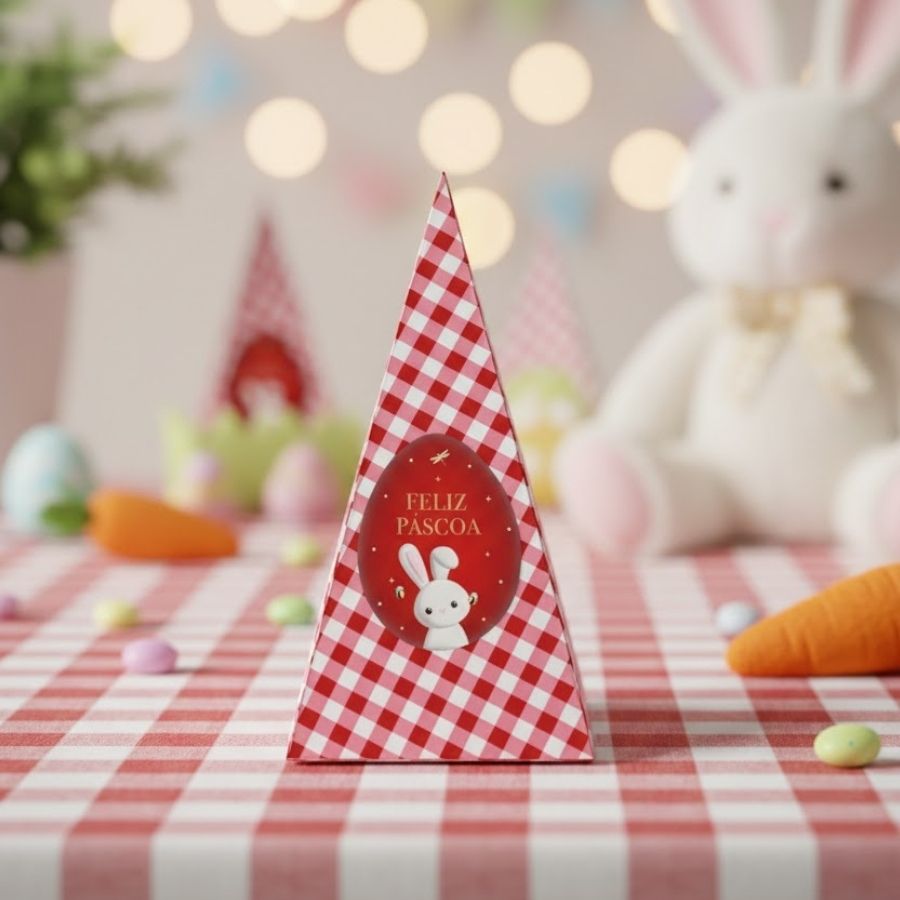 Caixa cone temática de Páscoa na cor vermelha, tamanho 5x5x14cm, perfeita para doces e lembrancinhas. Design inspirado em contos pascoais, ideal para presentear com estilo.