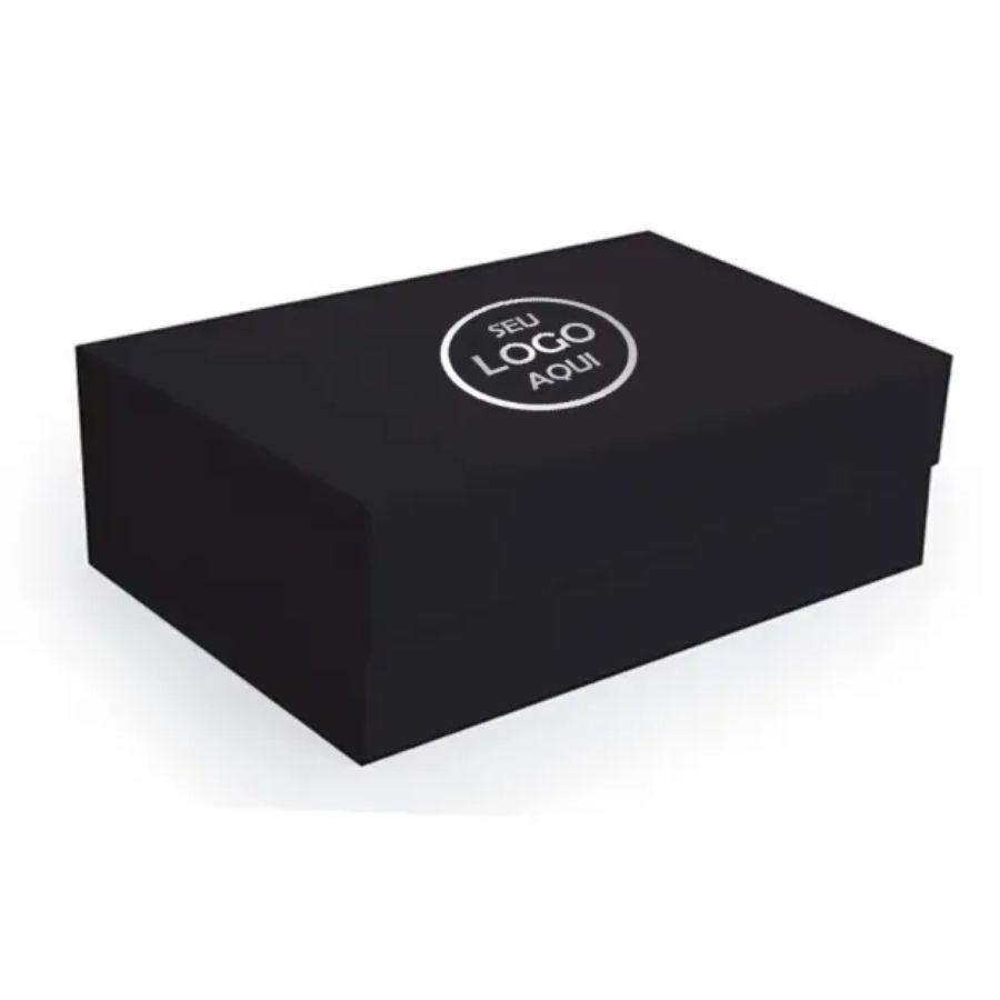 Possui 1 Caixa de Papel Rígido Retangular Preto com Ímã Personalizada com Adesivo Branco.