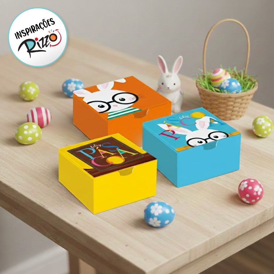 A Caixa Divertida para 4 Brigadeiros Páscoa Cores é uma embalagem sortida de 8,5x8,5x3,5cm, resistente, prática e ideal para presentear brigadeiros com um toque colorido e festivo de Páscoa.