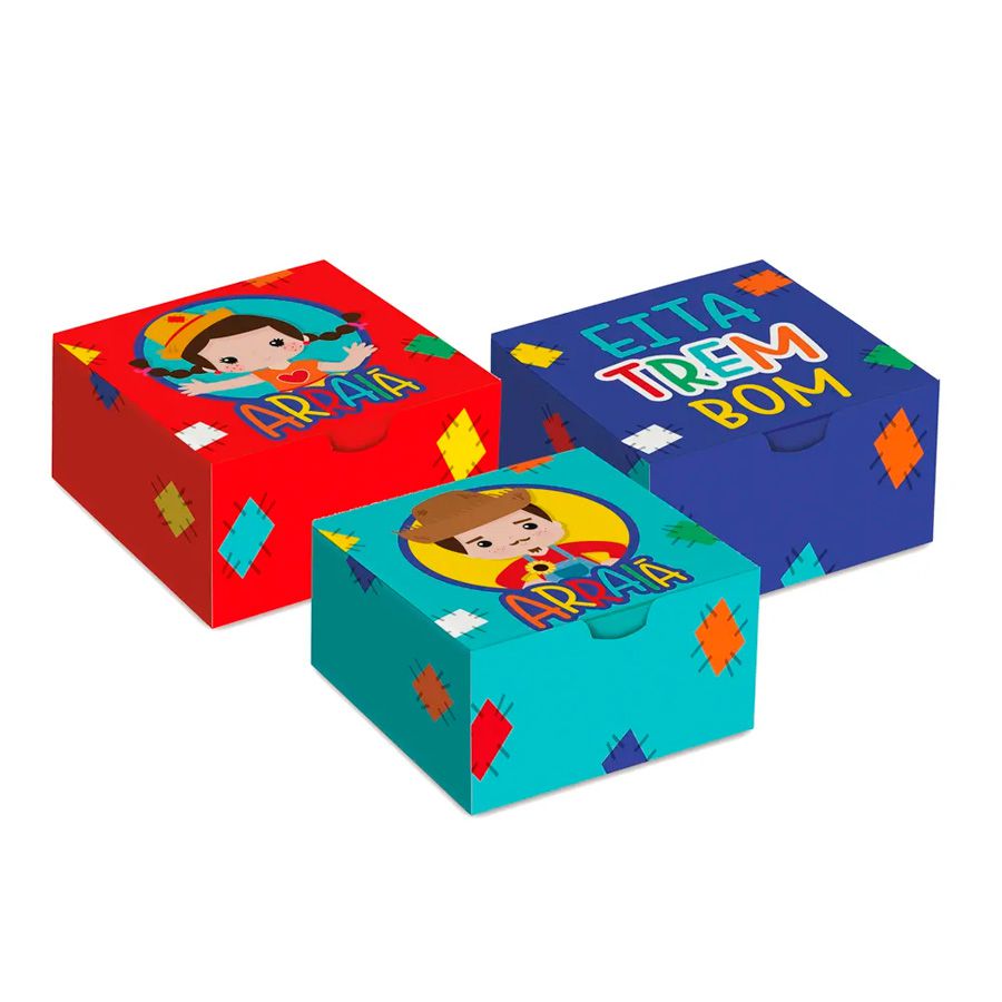 Pacote de caixas de papel cartão para doces, com 3 modelos de estampa, todas salpicado com figuras de costuras, com cor de fundo diferente e a mensagem, o primeiro de fundo vermelho destacando um circulo com uma garota caipira, com chapéu de palha e duas tranças e a mensagem abaixo "Arraiá", a 2° estampa não muito diferente, com o fundo azul claro destacando um circulo com um homem caipira, usando jardineira e chapéu de palha com a mesma mensagem e posição da estampa anterior, e a ultima com o fundo azul escuro destacando a mensagem "Eita Trem Bom"