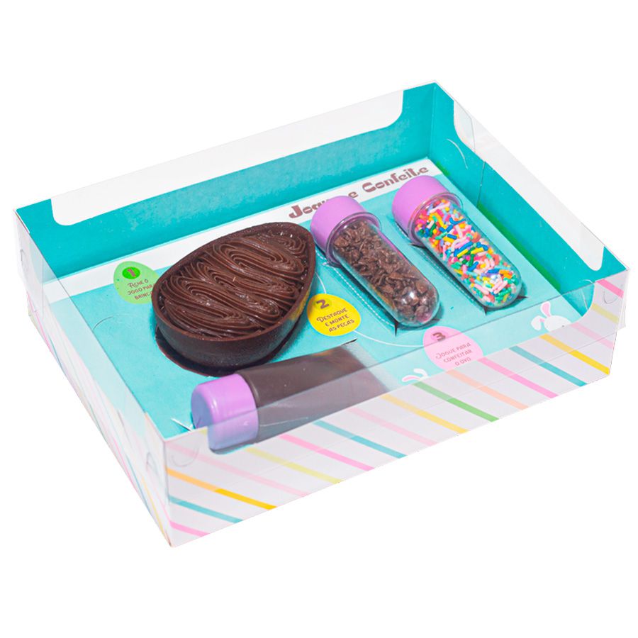 Para deixar o clima da páscoa divertido para as crianças, a Caixa para ovo com visor, decorada e toda colorida, ainda com um Jogo e Kit de mini confeiteiro, é a opção ideal para elevar a diversão.