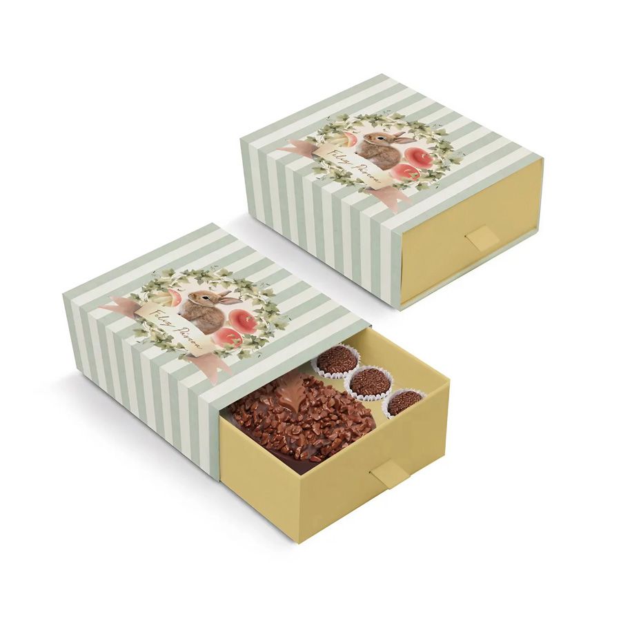 A Caixa Luva para Doces - Coelho Breeze é uma embalagem delicada e temática que une o encanto do coelho à serenidade do tema Breeze. Com um design meticuloso, esta caixa luva oferece uma apresentação encantadora para doces e pequenos presentes, destacando-se pela combinação harmoniosa de elementos que evocam a leveza da brisa e a alegria da Páscoa. Sua estrutura prática e estética refinada a torna ideal para valorizar e presentear com elegância.