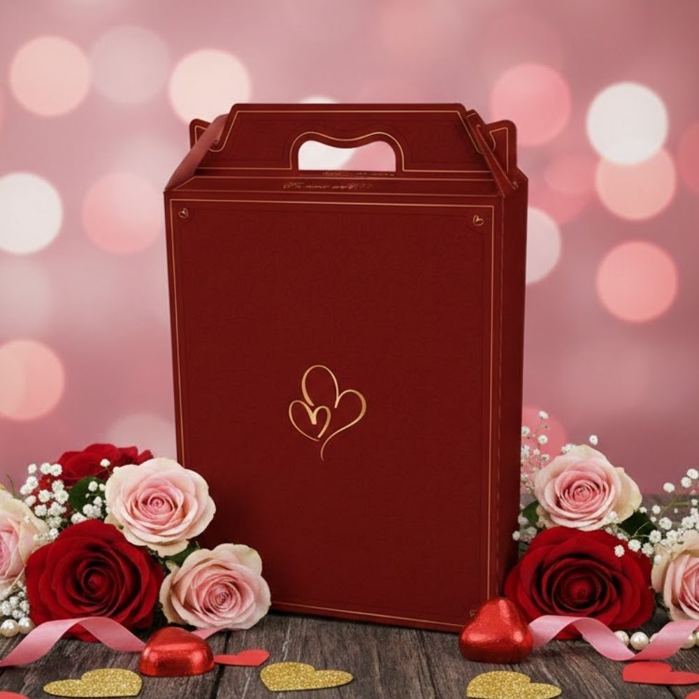 A Caixa Maleta Retangular Toque de Amor une praticidade e sofisticação em uma embalagem encantadora. Quando montada, transforma-se em uma maletinha firme com alça, facilitando o transporte e deixando a apresentação ainda mais especial. A linha apresenta a elegante base em marsala, com toda a superfície decorada por corações de diferentes tamanhos em tom próximo ao fundo, criando um efeito delicado e sofisticado. O acabamento conta com detalhes dourados nas bordas e corações dourados aplicados em pontos estratégicos.