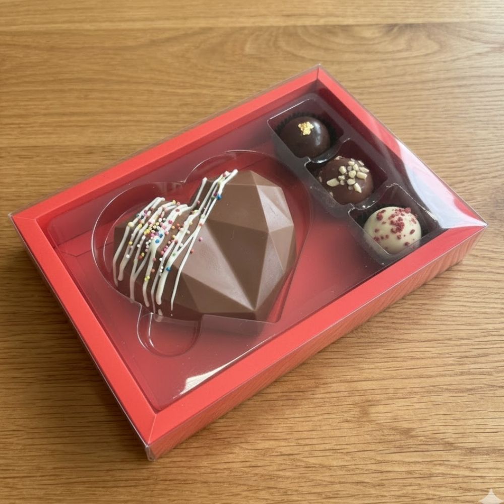 A Caixa Ovo Coração Plano e 3 Docinhos é perfeita para montar presentes delicados e cheios de carinho. Com espaço para 1 coração plano e mais 3 docinhos, trufas ou bombons, a embalagem permite uma composição equilibrada, valorizando diferentes formatos em uma apresentação única e charmosa.