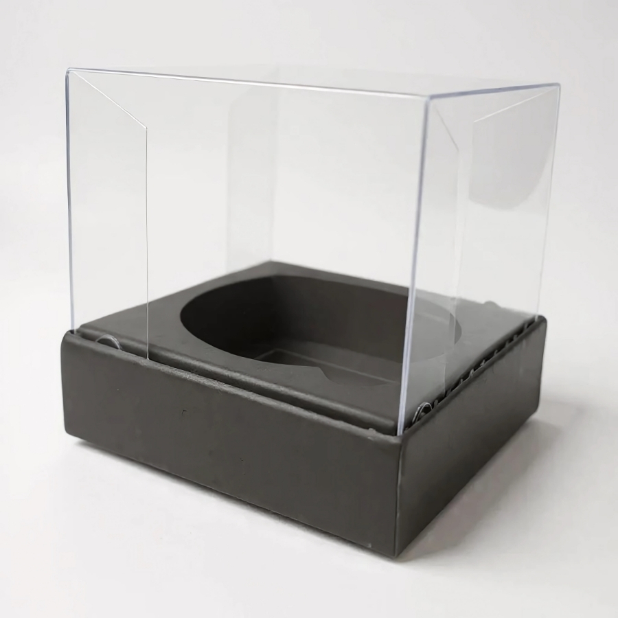 Com medidas de 7x7x7 cm, a caixa é confeccionada em papel cartão preto de alta gramatura e possui tampa em PVC transparente. O design cúbico é ideal para acomodar mini bolos com cobertura ou topo decorado, garantindo firmeza no transporte e destaque visual. É fácil de montar, empilhável e compatível com personalizações como fitas, tags ou adesivos, oferecendo versatilidade e praticidade no uso profissional.