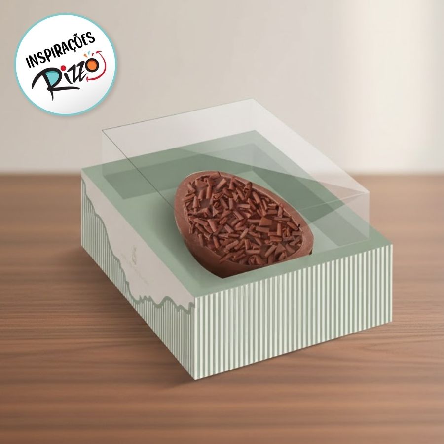 A Caixa New Moldura Lavie Sálvia para meio ovo de 350g com colher é sofisticada, durável e perfeita para transformar chocolates artesanais em presentes memoráveis e cheios de elegância.