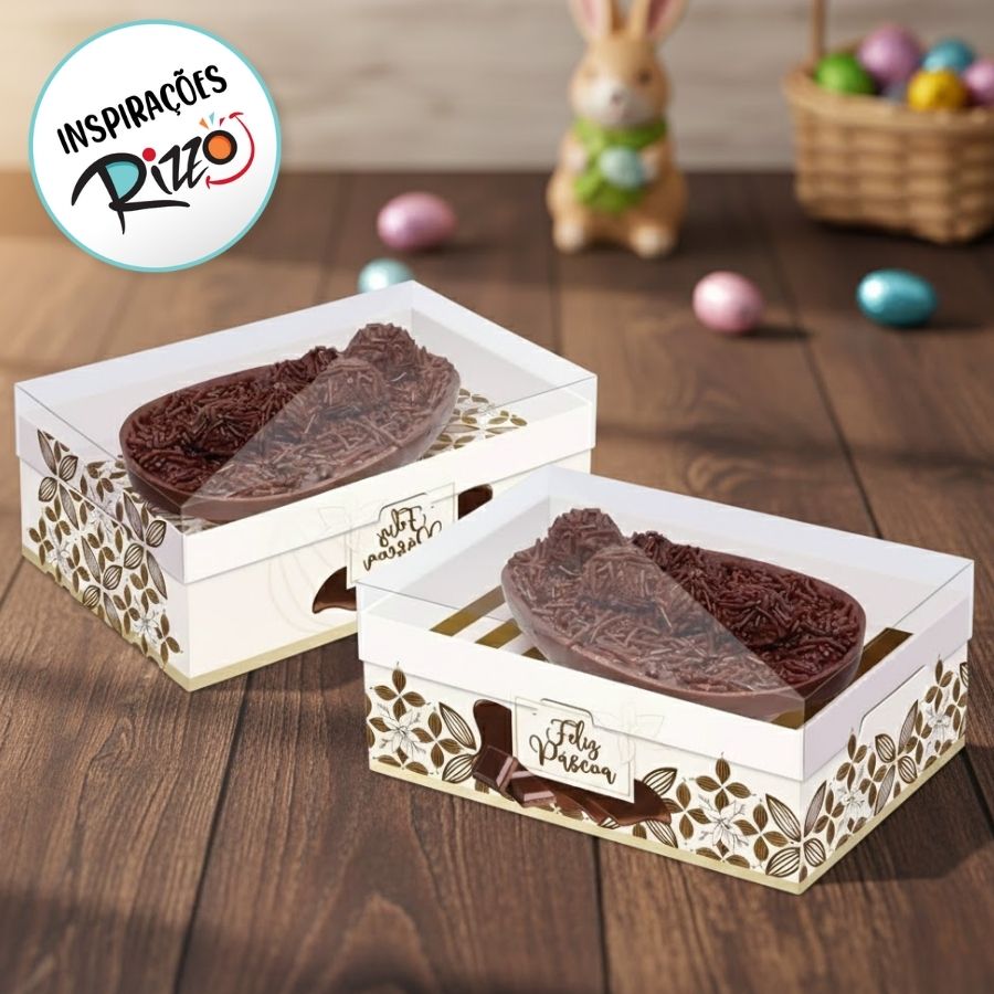 Produzida em material resistente, a Caixa New Practice Flor de Cacau Marfim possui sistema de regulagem de altura, permitindo o ajuste perfeito ao meio ovo de 500g e garantindo mais segurança no transporte. Seu design funcional facilita a montagem e possibilita personalizações com fitas, laços, tags e adesivos, agregando valor ao produto final. É uma excelente escolha para confeiteiros, chocolaterias e lojistas que buscam uma embalagem prática, bonita e com acabamento profissional.