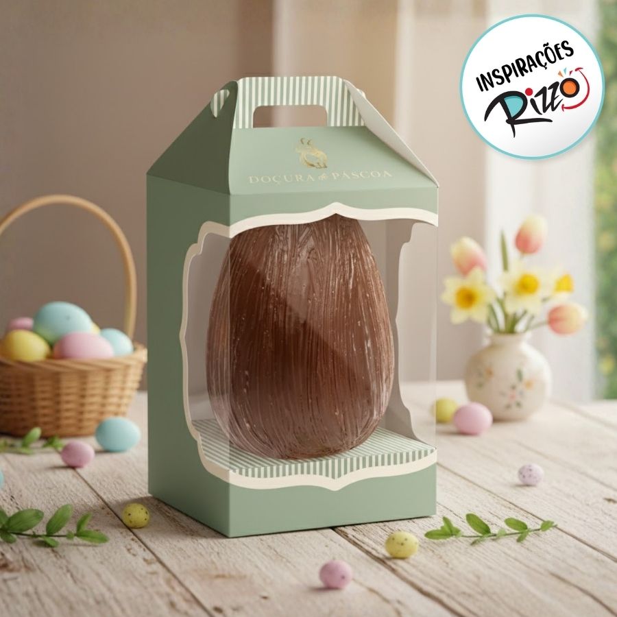 A Caixa New Practice para Meio Ovo de 500g é moderna, resistente e elegante, com acabamento em sálvia que realça o produto e facilita a apresentação.