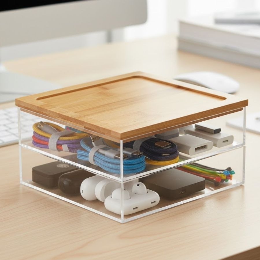 Esta caixa organizadora dupla é produzida em acrílico transparente e possui tampa de bambu, unindo funcionalidade e design contemporâneo em uma única peça. Seu formato com compartimentos internos facilita a organização e o acesso aos itens, mantendo tudo visível, protegido e bem acomodado.