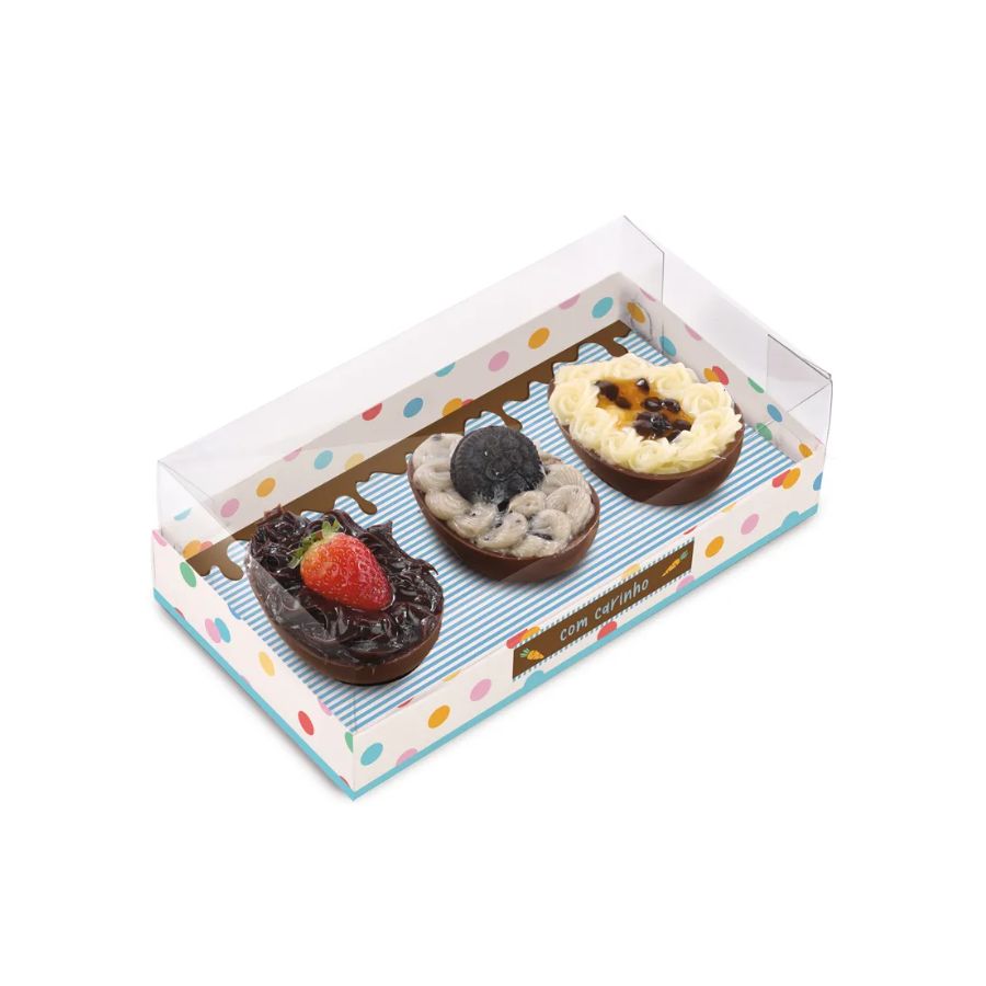 A Caixa Para 3 Meios Ovos 50g - Jump é a escolha ideal para quem deseja presentear ou vender ovos de Páscoa de maneira organizada e sofisticada. Com 15,5x8x5cm, ela acomoda perfeitamente três meios ovos de 50g, garantindo segurança e uma apresentação impecável.
