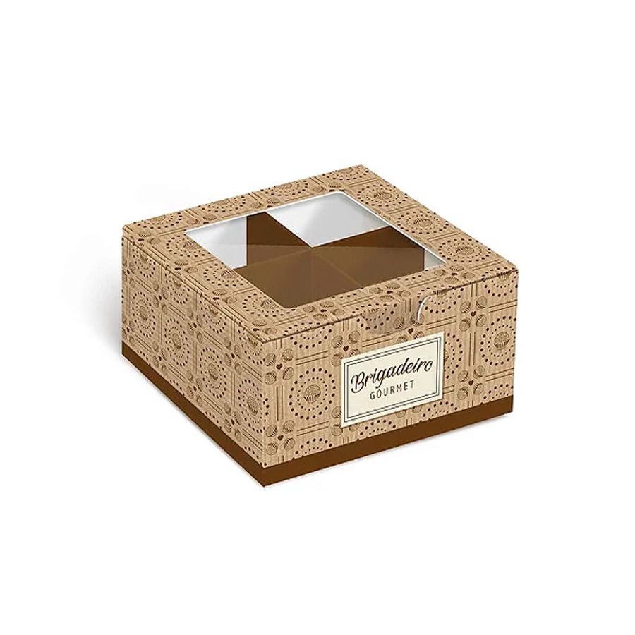 Caixa de Papel Cartão com 4 espaços para brigadeiros, e um visor na tampa, com estampa de varios brigadeiros