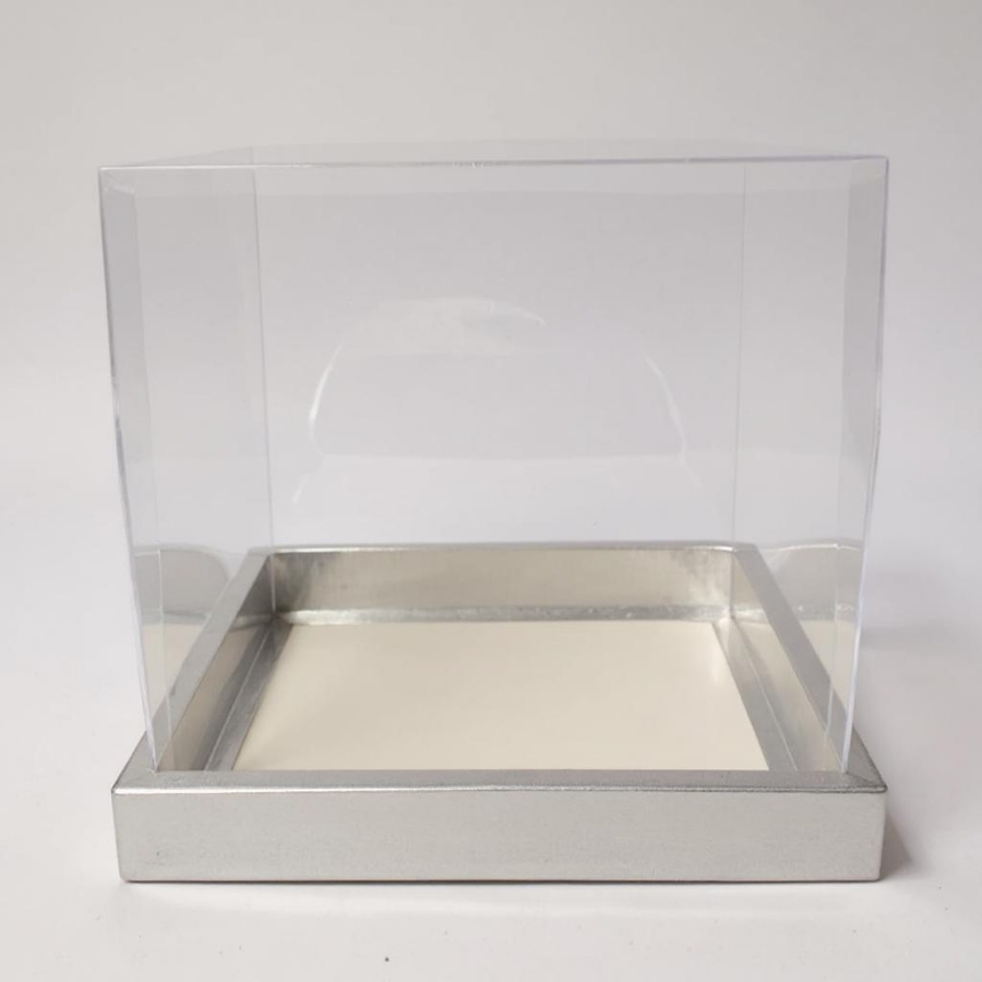 Caixa para bolo com visor em PVC transparente e base firme em papel cartão na cor prata com textura. Dimensões aproximadas: 20cm x 20cm x 20cm. Estrutura desmontável, fácil de montar, com excelente resistência. Indicada para bolos de pequeno e médio porte, ideal para confeitaria, entregas, vitrines e presentes personalizados.