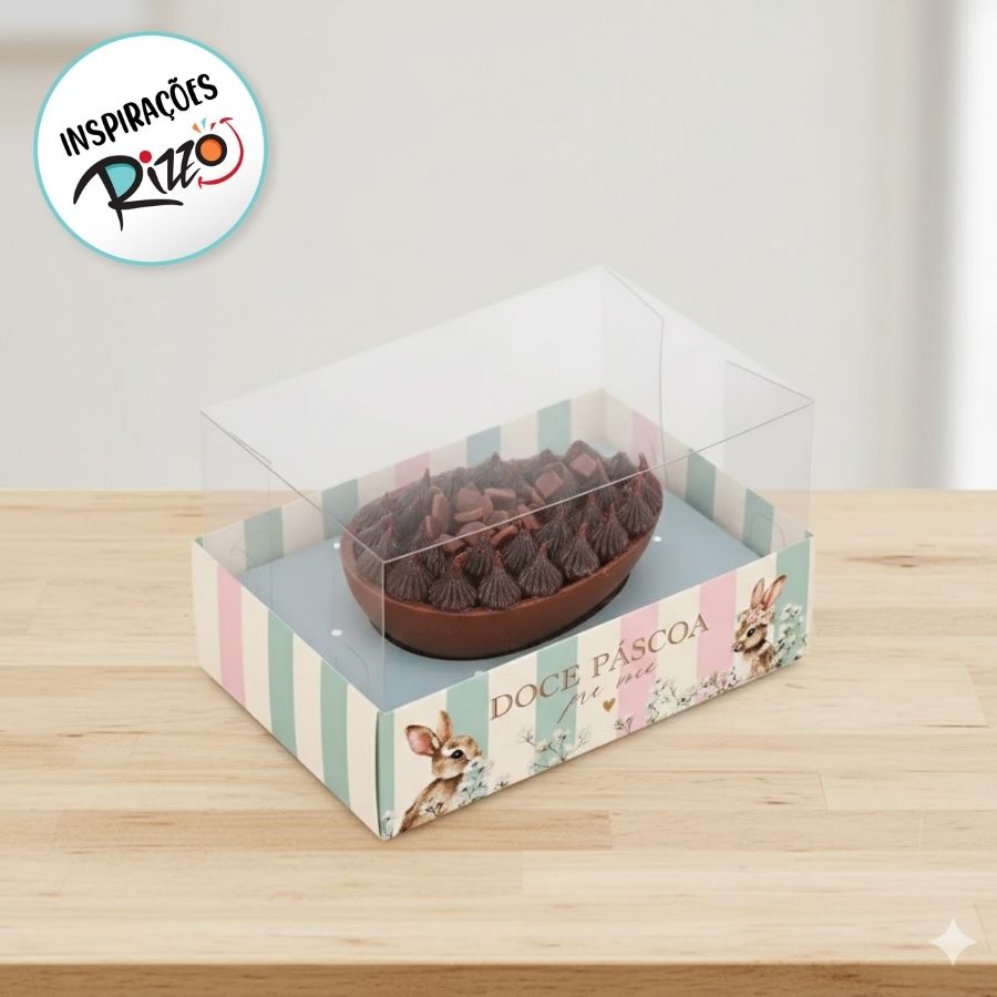 A Caixa para Meio Ovo 100 a 150g Páscoa Horizonte Doce Páscoa é moderna, temática e perfeita para destacar ovos artesanais com delicadeza, estilo e charme.
