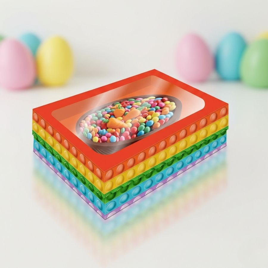 A Caixa Para Ovo Com Visor e Tampa P Pop It é uma embalagem divertida e prática, perfeita para presentear ovos de Páscoa de maneira criativa. Com capacidade para acomodar dois ovos, ela conta com uma tampa com visor transparente, permitindo que o conteúdo seja visualizado de forma atraente. O design inspirado no brinquedo Pop It traz cores vibrantes e um toque lúdico, tornando a embalagem ideal para encantar crianças e adultos.