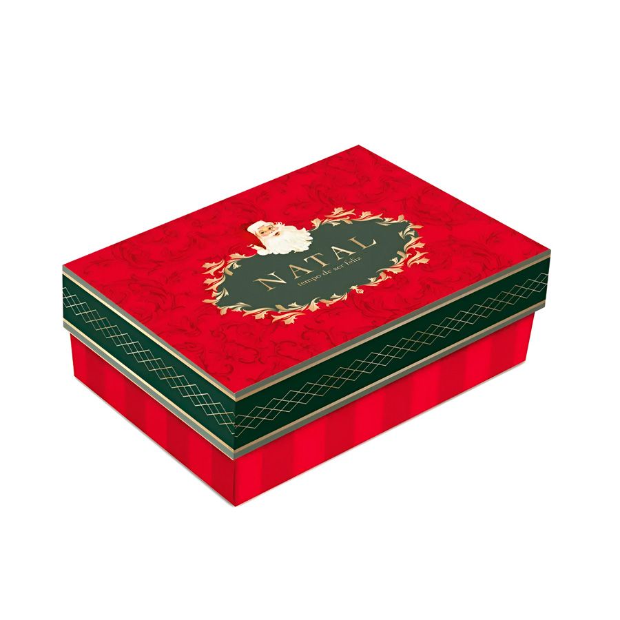 Caixa retangular com tampa de natal, cores verde e vermelho.