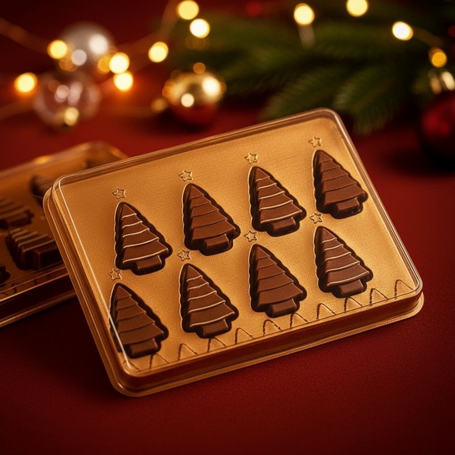 Caixa dourada de acetato com 8 cavidades em formato de Árvore de Natal, ideal para bombons premium, lembranças e kits temáticos de fim de ano. Estrutura rígida, acabamento sofisticado e excelente apresentação para vendas sazonais.