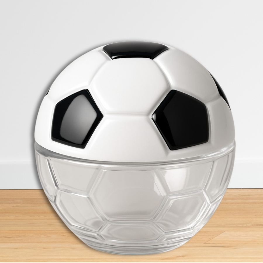Mini bola de futebol em acrílico transparente, ideal para lembrancinhas criativas, decoração temática esportiva e embalagens divertidas.