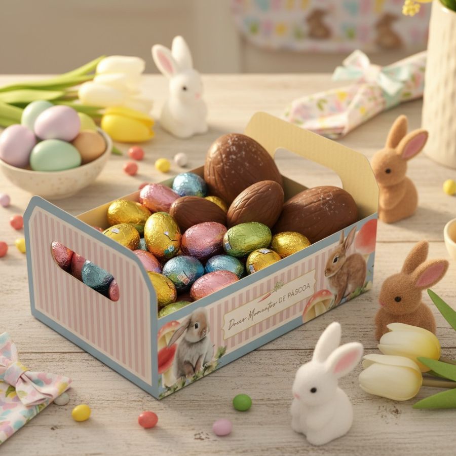 O caixote se destaca pelo design atrativo e pelo acabamento de alta qualidade, sendo perfeito para embalagens artesanais, kits de Páscoa, decorações de mesa ou pequenas composições decorativas. Sua estrutura firme permite acomodar doces, chocolates ou pequenos objetos sem perder a forma, podendo ser combinado com fitas, etiquetas ou outros acessórios decorativos para criar apresentações personalizadas e encantadoras.