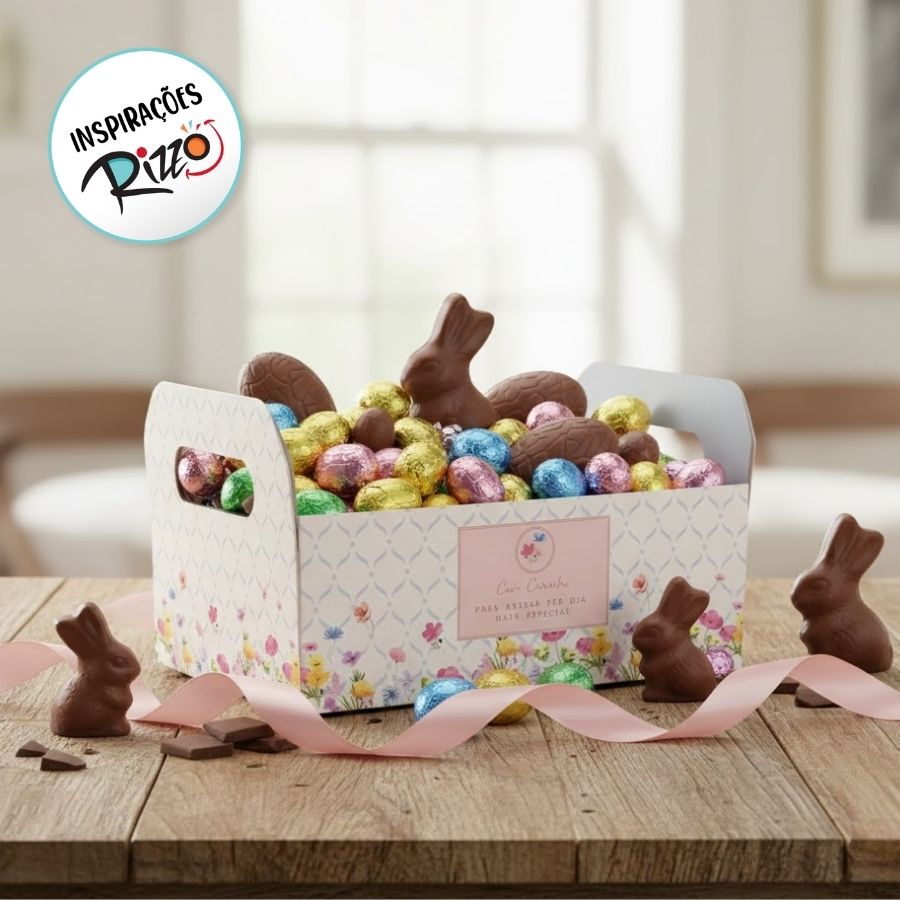 O Caixote de Papel Cartão de Páscoa modelo Florens é uma embalagem elegante e funcional para montar cestas, kits presenteáveis e composições especiais de Páscoa. Com medidas de 25x19x10cm, ele oferece amplo espaço para acomodar ovos de chocolate, doces, bebidas, pelúcias e itens decorativos, valorizando a apresentação do presente.