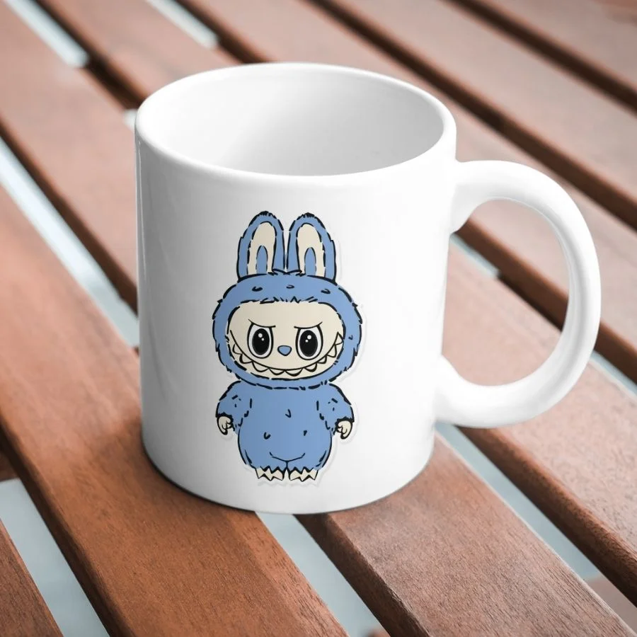 Caneca de porcelana estampada com o personagem Labubu, disponível em quatro cores e com capacidade de 325ml. Perfeita para uso diário ou como presente personalizado.