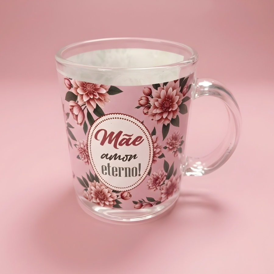 Caneca de vidro transparente nas cores rosa e com flores, com estampa da frase “Mãe Amor Eterno”. Capacidade de 320ml. Indicada para uso com bebidas. Produto fabricado em vidro. Recomenda-se manuseio cuidadoso para evitar quedas ou impactos que possam causar danos. A capacidade informada corresponde ao volume máximo aproximado que a caneca comporta.